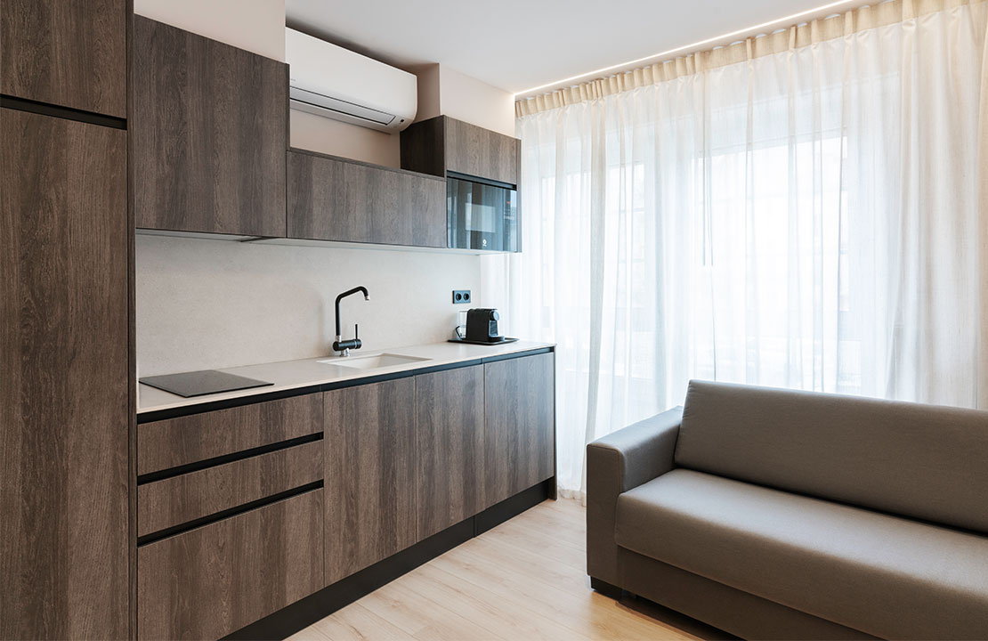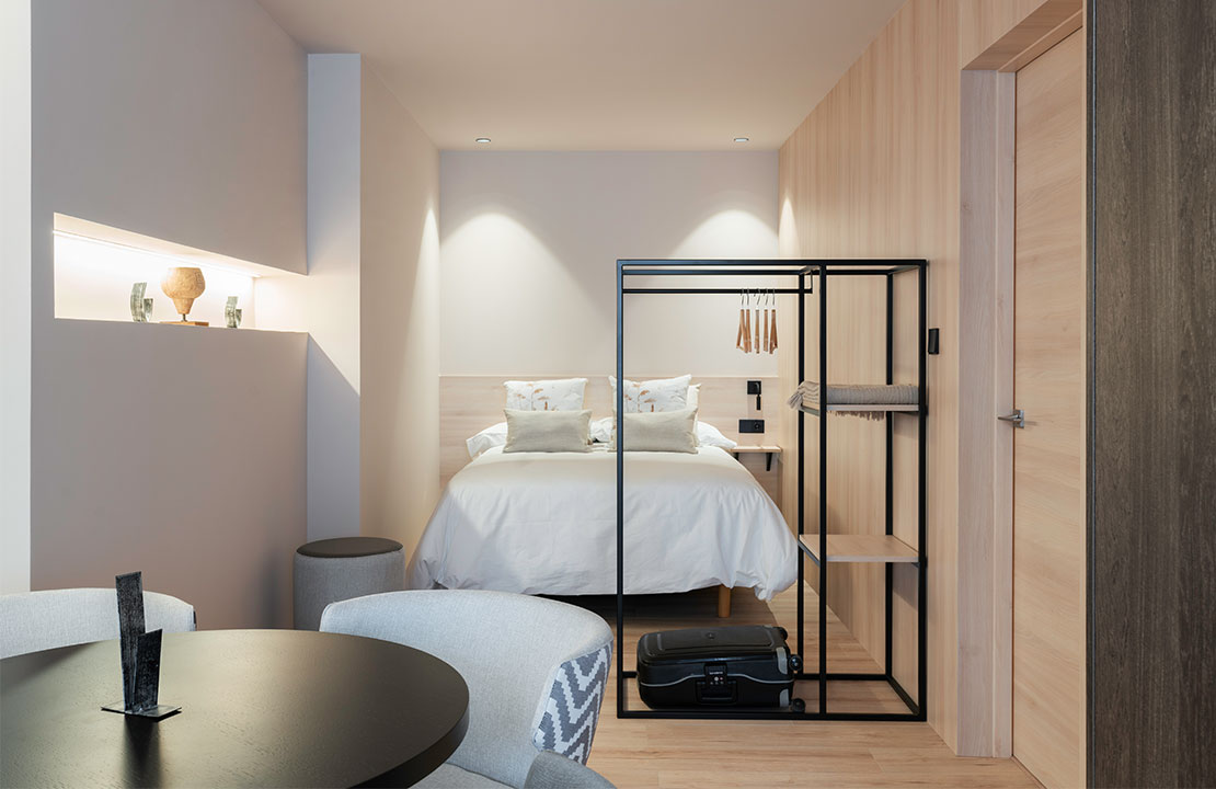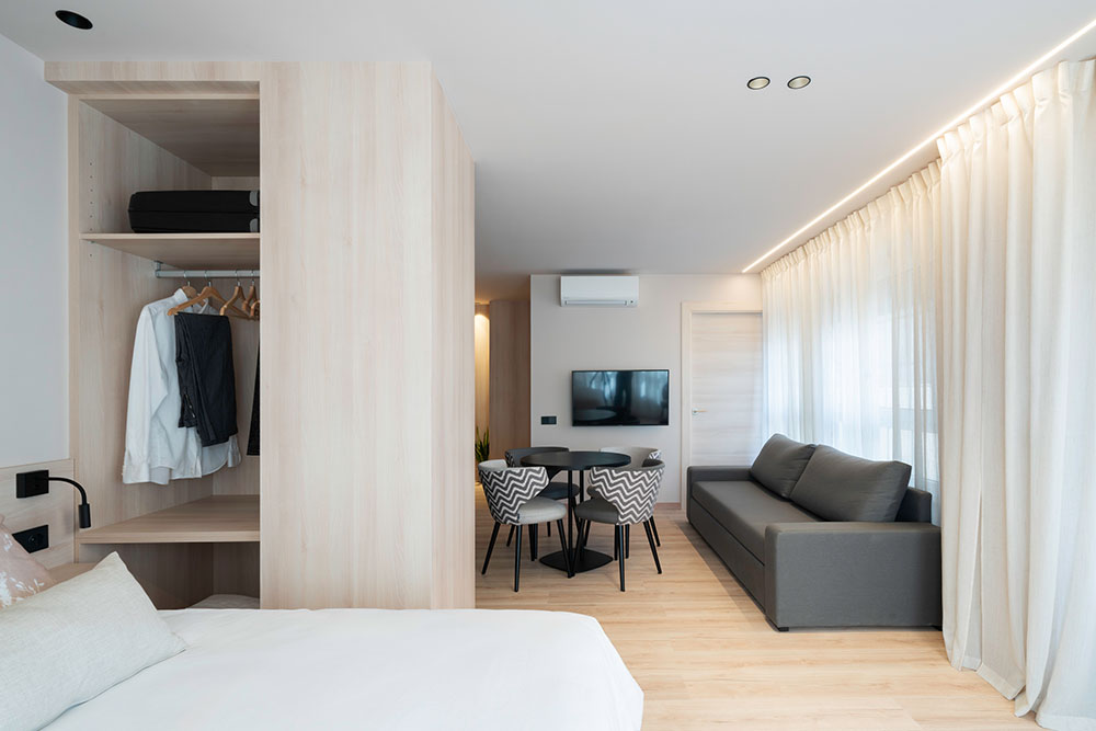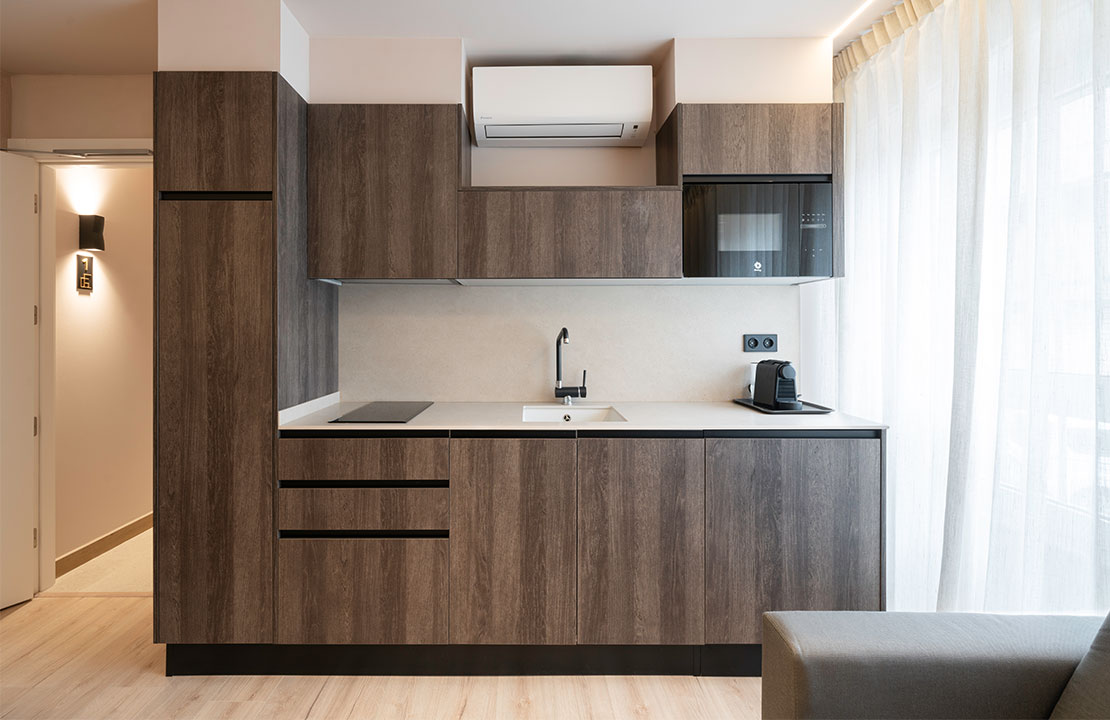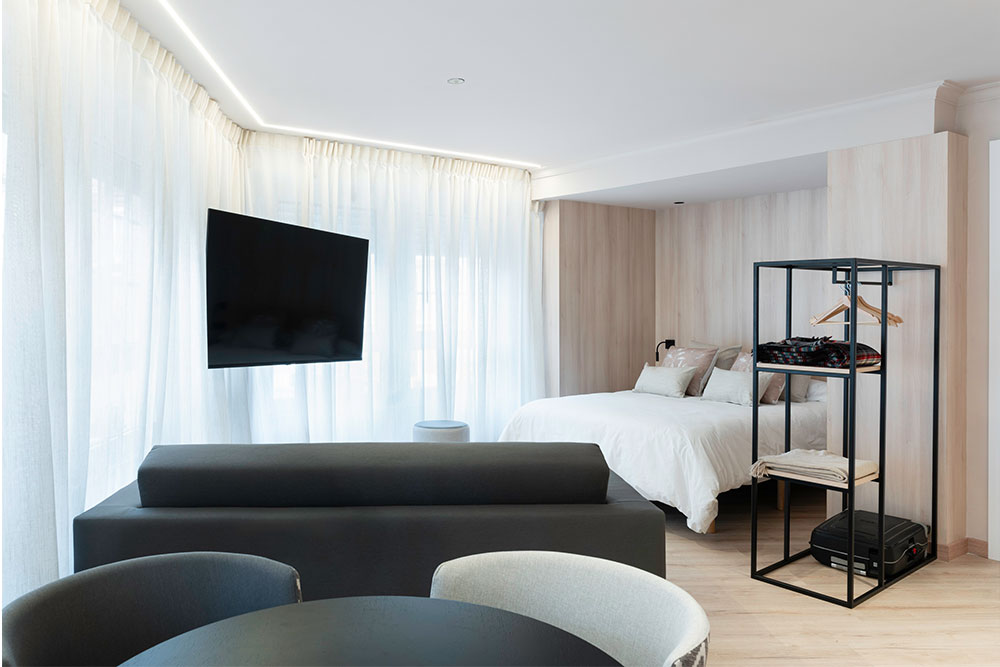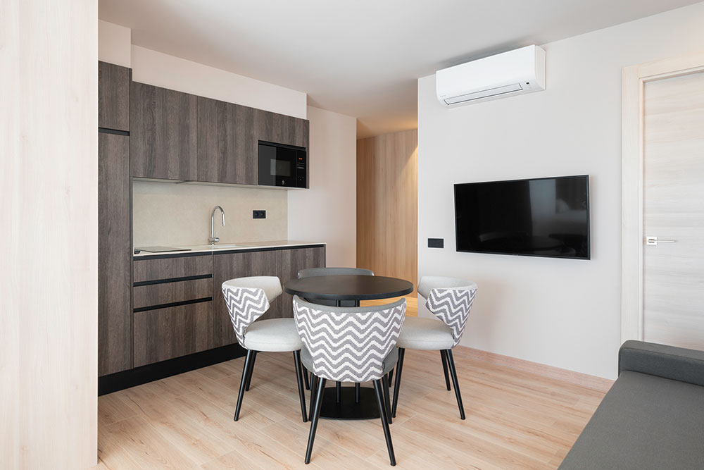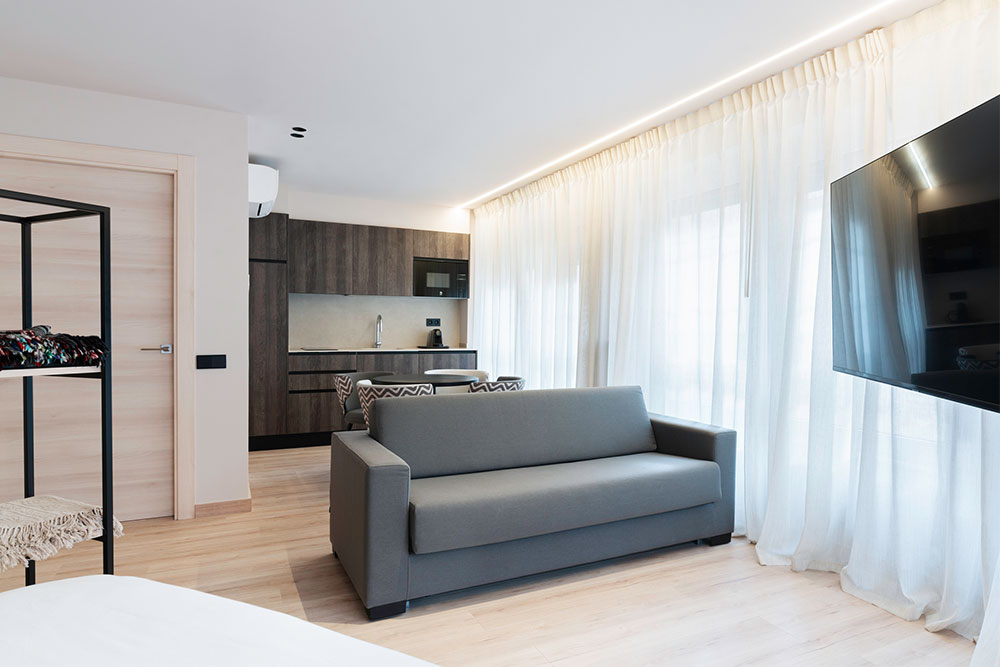 - Servicios Aire acondicionado / Calefacción, Baño privado con ducha, toallas y artículos de aseo de primera calidad, Cafetera, Camas y sofá cama con sábanas, Cocina equipada, Llegada autónoma con cerradura inteligente, Salón con mesa, sillas y sofá, Smart TV vía satélite de pantalla plana, Wifi